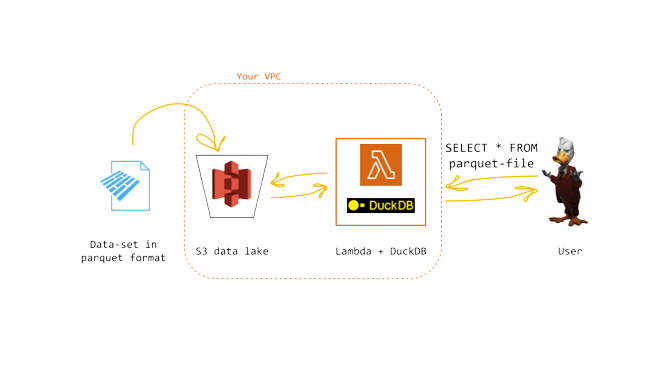 This cool project helping you running DuckDB serverless over a data lake on S3 using AWS Lambda. Seeing the blog post for more detail.